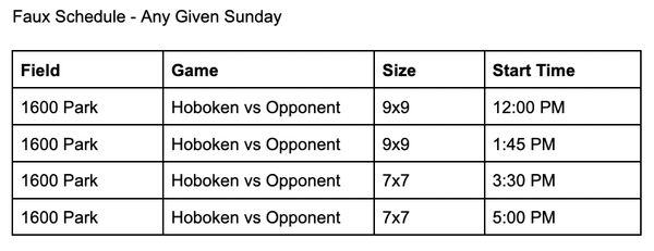 Your game is NOT confirmed until you receive an email back from Hoboken United saying CONFIRMED. Just because you sent it in does not automatically mean you are confirmed, other teams may have requested the same time before you.